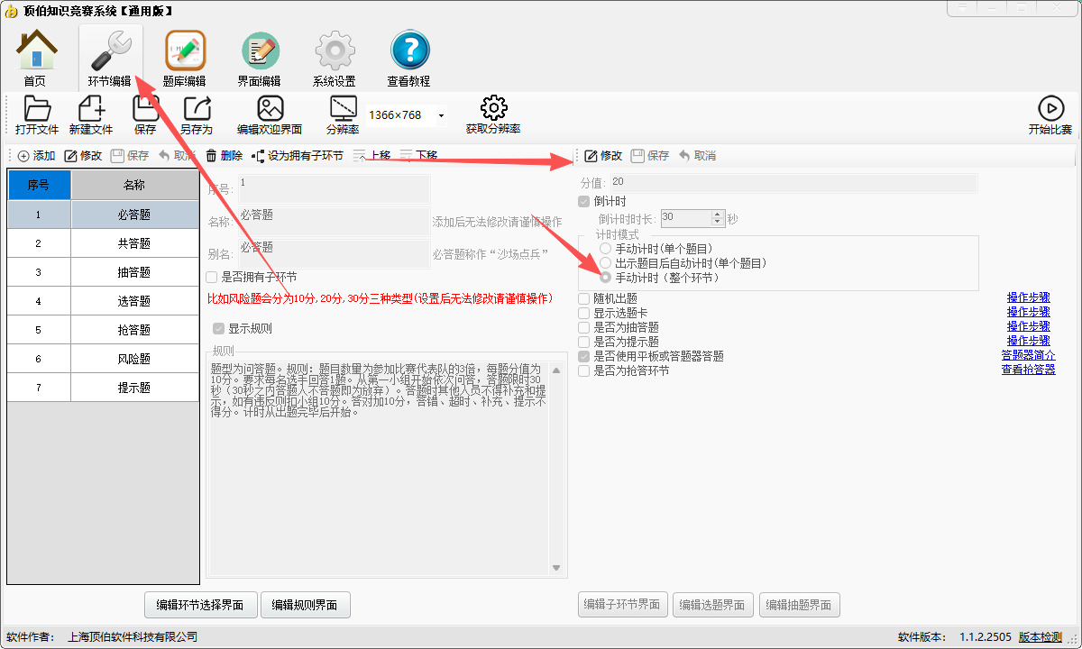 1.设置平板速答题需要打开顶伯知识竞赛系统—点击环节编辑,在右边点击修改,勾选倒计时,下面勾选手动计时